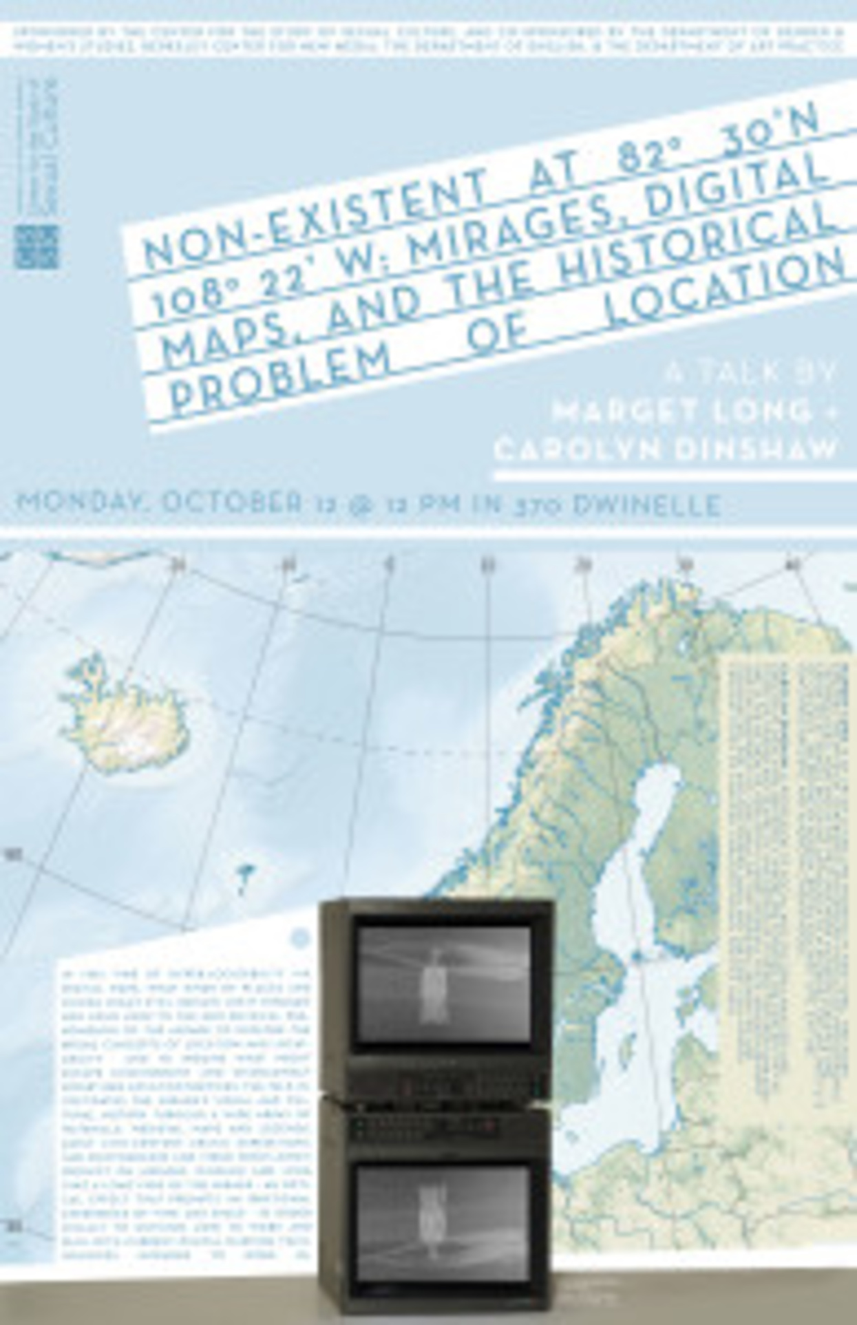 In this time of hyper-locatability via digital maps, what kinds of places and things might still remain lost? Dinshaw and Long look to the geo-physical phenomenon of the mirage to explore the broad concepts of location and locatability–and to imagine what might escape ever-present and increasingly monetized location services. The talk investigates the mirage’s visual and cultural history through a wide array of materials: medieval maps and legends, early 20th-century Arctic expeditions, and photographs and video from Long’s project on mirages. Dinshaw and Long take a long view of the mirage–an optical effect that prompts an irrational experience of time and space–in order finally to envision how to work and play with current digital mapping technologies intended to work us.