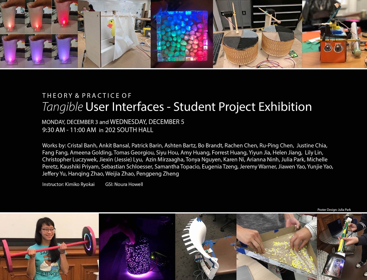 "Theory and Practice of Tangible User Interfaces" class will be having student project exhibitions on Monday 12/3 and Wednesday 12/5. All projects will be on display both days, from 9:30AM - 11:00AM in room 202 South Hall. Refreshments will be served. Please stop by for a chance to try the experimental interfaces for yourself!