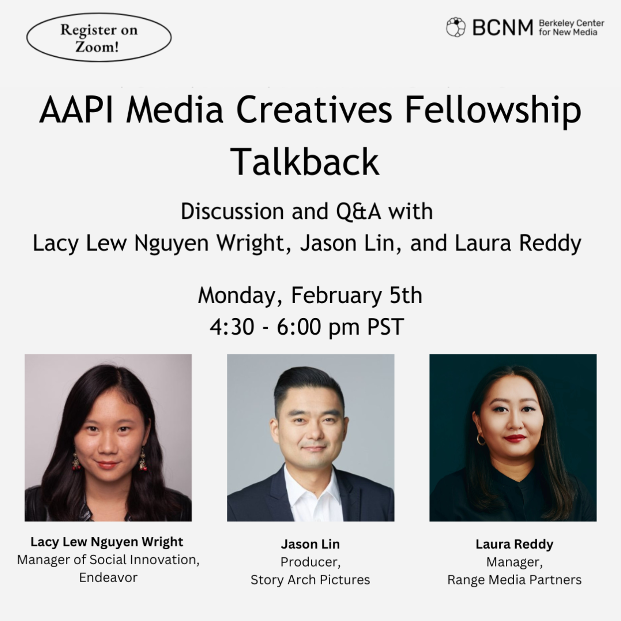 Join AAPI industry leaders Lacy Lew Nguyen Wright (Manager of Social Innovation, Endeavor), Jason Lin (Producer, Story Arch Pictures), and Laura Reddy (Manager, Range Media Partners) for a conversation on what it means to make your way in Hollywood as an AAPI creative.