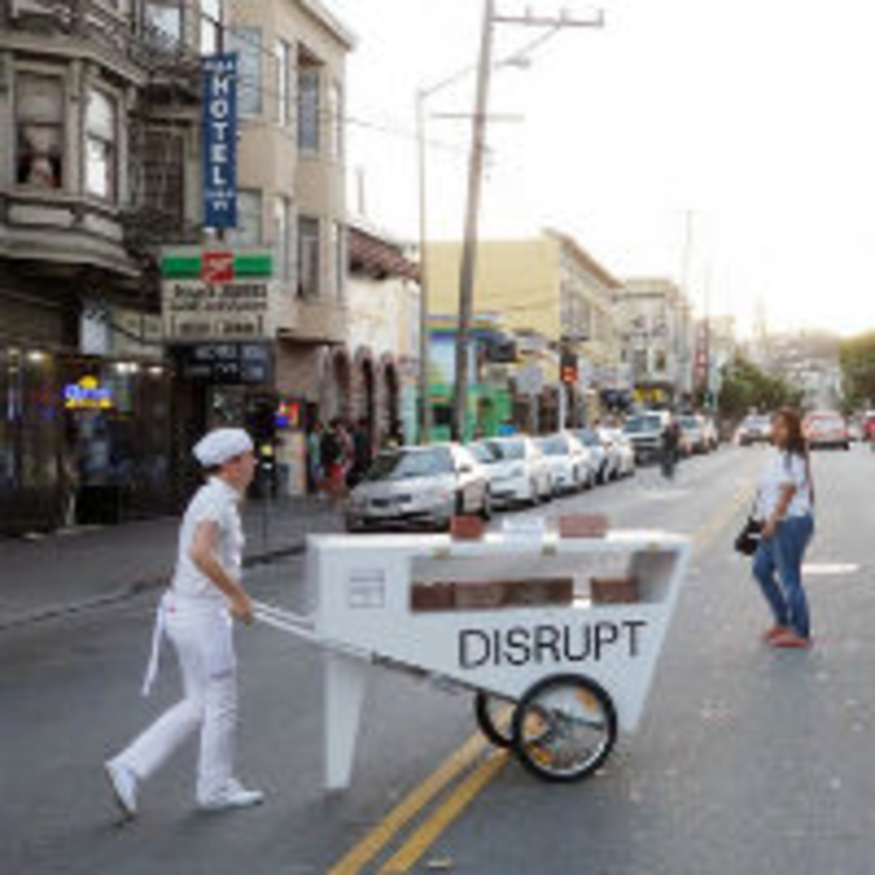 On Thursday, November 13, we were thrilled to host the art installation opening for Reclaim Disrupt, a performance project designed and implemented by interdisciplinary artist and activist Leslie Dreyer. To tackle issues surrounding the Bay area housing crisis, Leslie visited demolition sites to collect bricks, which she etched with the stories of those who have faced eviction in the Bay. She then sold these bricks from a vendor cart at Tech Crunch's Disrupt conference in San Francisco on September 10, 2014. Clad in server attire but vending quite unusual fare, she invited passersby to consider other potential meanings of "disrupt." Since the bricks took an hour each for Leslie to make, she chose to sell the bricks at a variable price that shifted based on the purchaser's hourly wages, net wealth, and role in displacement. For example, a minimum wage worker with few assets could buy a brick for $10.74. Mark Zuckerberg, on the other hand, would have had to pay $1.6 million (his estimated hourly wage earnings). Leslie staged Reclaim Disrupt once again at Plaza 16's No Monster in the Mission march and festival for affordable housing. Unlike at Tech Crunch, more than half the bricks sold in this context as the audience were personally moved by their own experiences being reproduced in art. A portion of Leslie's profits go towards affordable housing the Bay area. At the BCNM installation, you can see the bricks Leslie sells, along with the cart, and a video of the conversations she had at Tech Crunch's Disrupt and the No Monster in the Mission march.