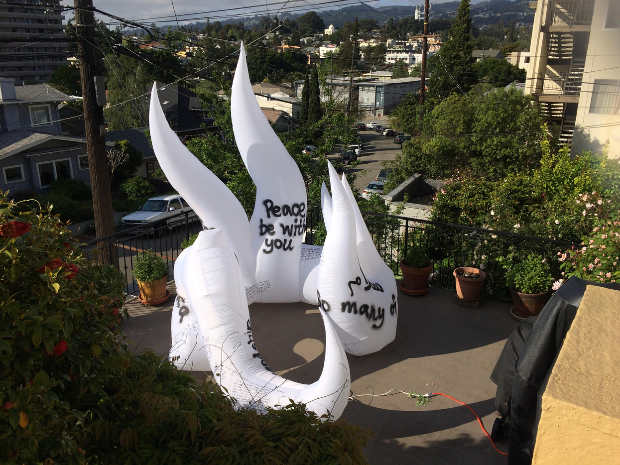 Noura Howell’s “Salaam Sculpture” was featured on the UC Berkeley campus this Spring. A collaboration with Sahil Mohan and Stan Clark of Astro Botanicals, the sculpture was featured on April 22nd and 23rd at the Islamaphobia conference and for 2 more days in front of South Hall. The interactive white inflatable takes the shape of the calligraphy for the Arabic word ‘Salaam’ or peace, which is also a ubiquitous greeting in many Muslim countries. Noura invited viewers to write on the sculpture and leave their own message with markers.