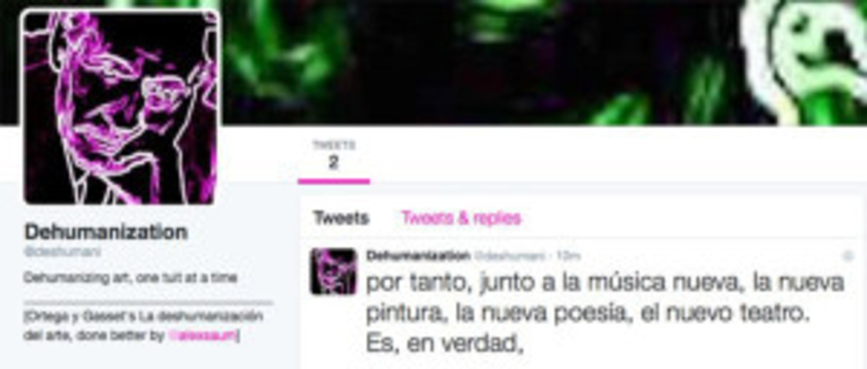 BCNM's Alex Saum Pascual has a new Twitter handle, @deshumani, which seeks to take Spanish philosopher José Ortega y Gasset's "The Dehumanization of Art" into the 21st century. Published in 1925, "Dehumanization" explored the rebellion in avant-garde art of the 1920s against the 'human' in art, capturing the intellectual ferment of the avant-garde movement in Spain and providing an important approach to analyzing contemporary art. Saum Pascual takes this work into the digital age by breaking it down into tweets which provide snippets of thought, reforming the text into a series of disjointed fragments which echo the avant-garde movement's break with logical nexuses and subjectivism.