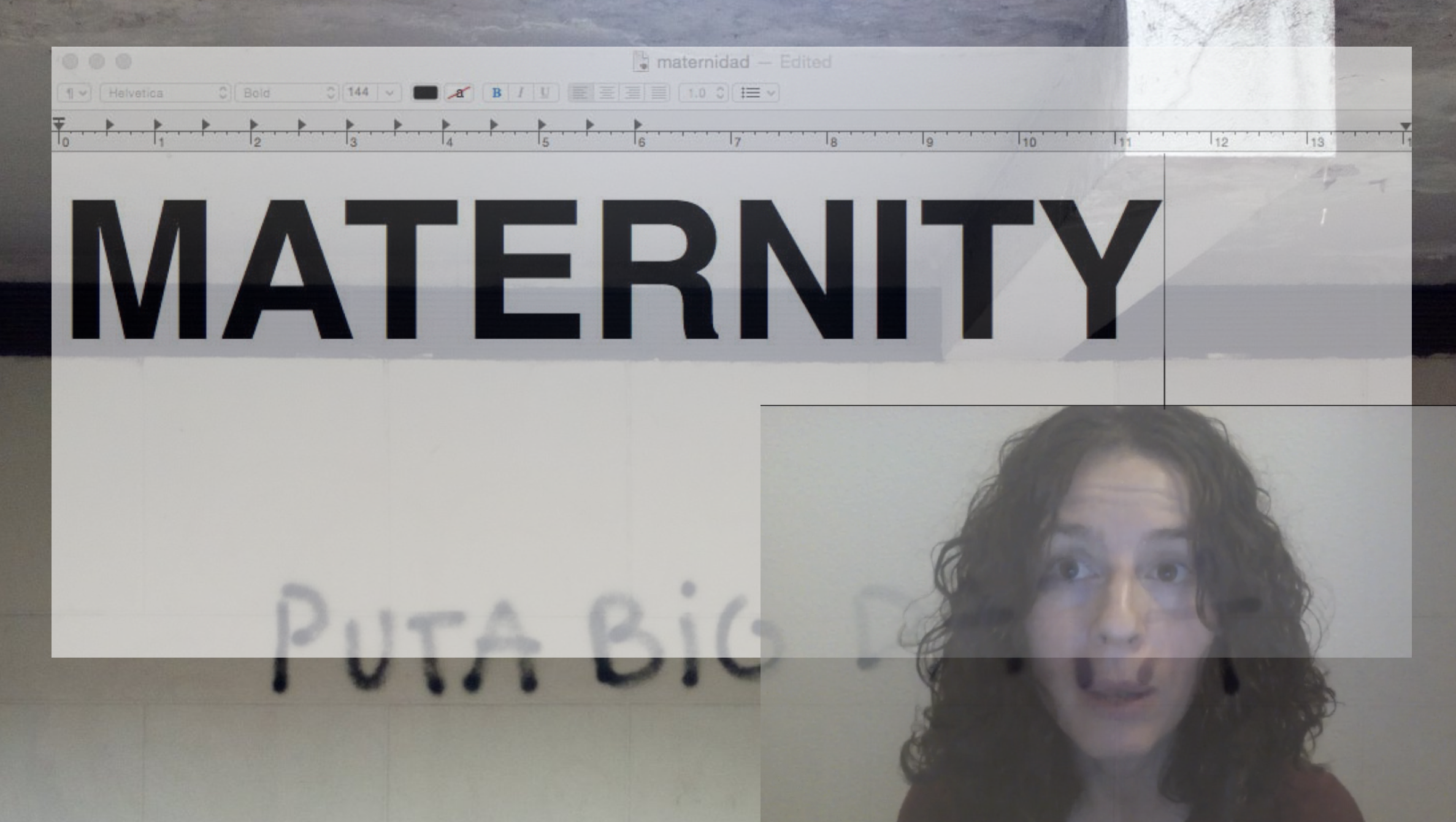 This video is overlayed with other images in the background, such as the word "MATERNITY" in a text editor with a blinking cursor. Behind that, is a graffiti wall with the phrase "PUTA BIG DATA."