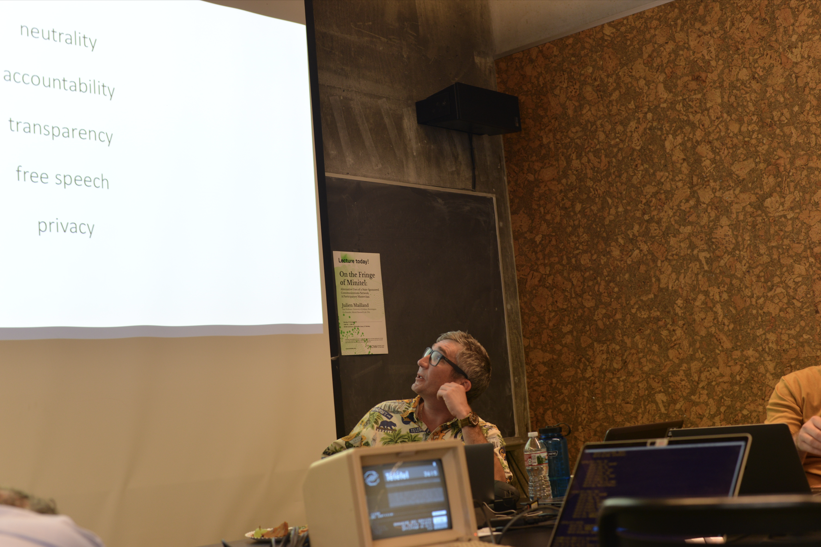During the talk, Mailland explored more of the background of Minitel and its French origins in the 1980’s, focusing on its early technological impact, connecting France around 15 years before the internet came to the United States. He also drew on bigger issues surrounding Minitel and technology, bringing up concerns with privacy, freedom of speech, etc. in addition to highlighting larger uses of Minitel; while Minitel computers were useful for buying concert tickets or banking, it also served as a crucial meeting place for organizers and activists to come together and discuss “fringe topics” or even share resources, as did the LGBTQ+ community during the AIDS epidemic. To effectively convey his research and information regarding Minitel Technologies, Mailland made the discussion more interactive, inviting everyone to use their laptops to try out live, Minitel-inspired chat rooms online.