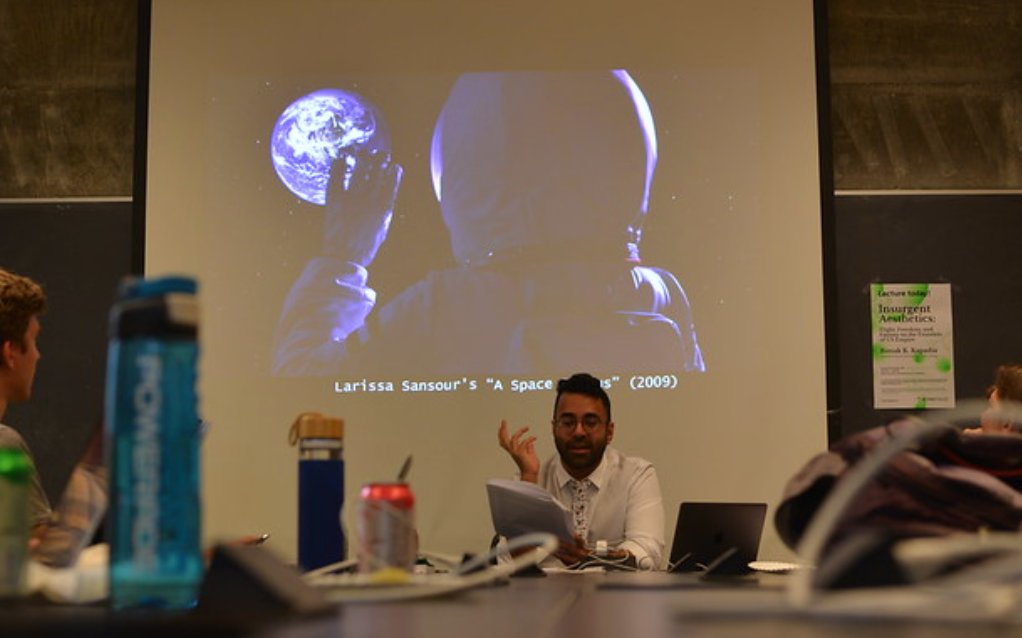 In "Insurgent Aesthetics," he specifically uses a queer, feminist, anti-colonial and indigeneous lens to view the discourse on global control. He even drew connections on new military technologies from both US and Israel, and how space tehcnologies and cybersecurity play a prominent role in these spaces.