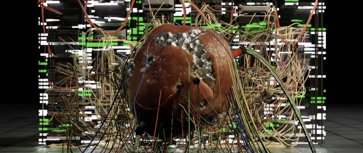 Constructed from 2,000 pounds of reclaimed e-waste, Carbonivore speculates on a grotesque hybrid creature composed of wires, servers, and rare earth materials—physically and metaphorically linking our devices to the mines, labor, and ecological damage that enable them. The installation is part of Gray Area’s C/Change initiative, produced in collaboration with the Goethe Institut San Francisco.